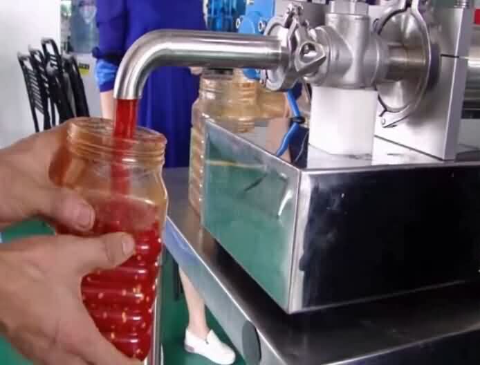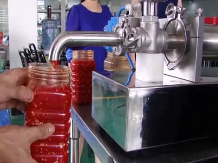 有人問灌裝辣椒醬選擇哪款機(jī)型呢?之前看一個視頻就是灌裝辣椒醬還是膏液灌裝機(jī),那為什么我這灌裝剁辣椒醬不可以呢?小編來給您普及下膏液灌裝機(jī)和濃醬灌裝機(jī)之間的區(qū)別那就是:膏液灌裝機(jī)能灌裝不能帶顆粒的醬類食品和液體,剁辣椒醬屬于帶顆粒醬類食品,所以要用醬類灌裝機(jī)才可以,那么醬類灌裝機(jī)定量灌裝剁辣椒醬效果如圖所示: